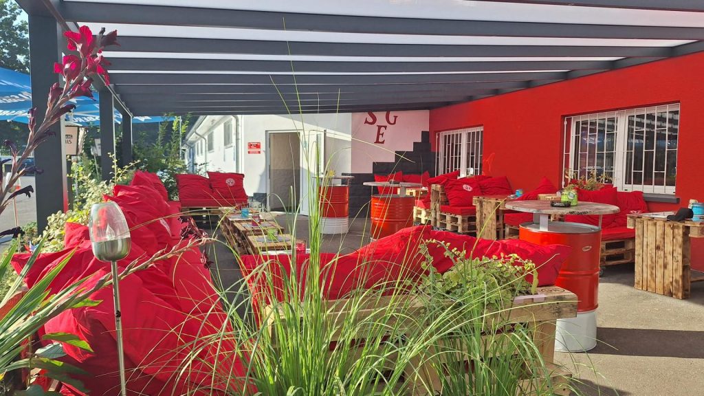 Vor der Wirtschaft laden gemütliche Palettensofas zum Verweilen ein und dank Saarbau schützt euch eine schicke Überdachung bei jedem Wetter.